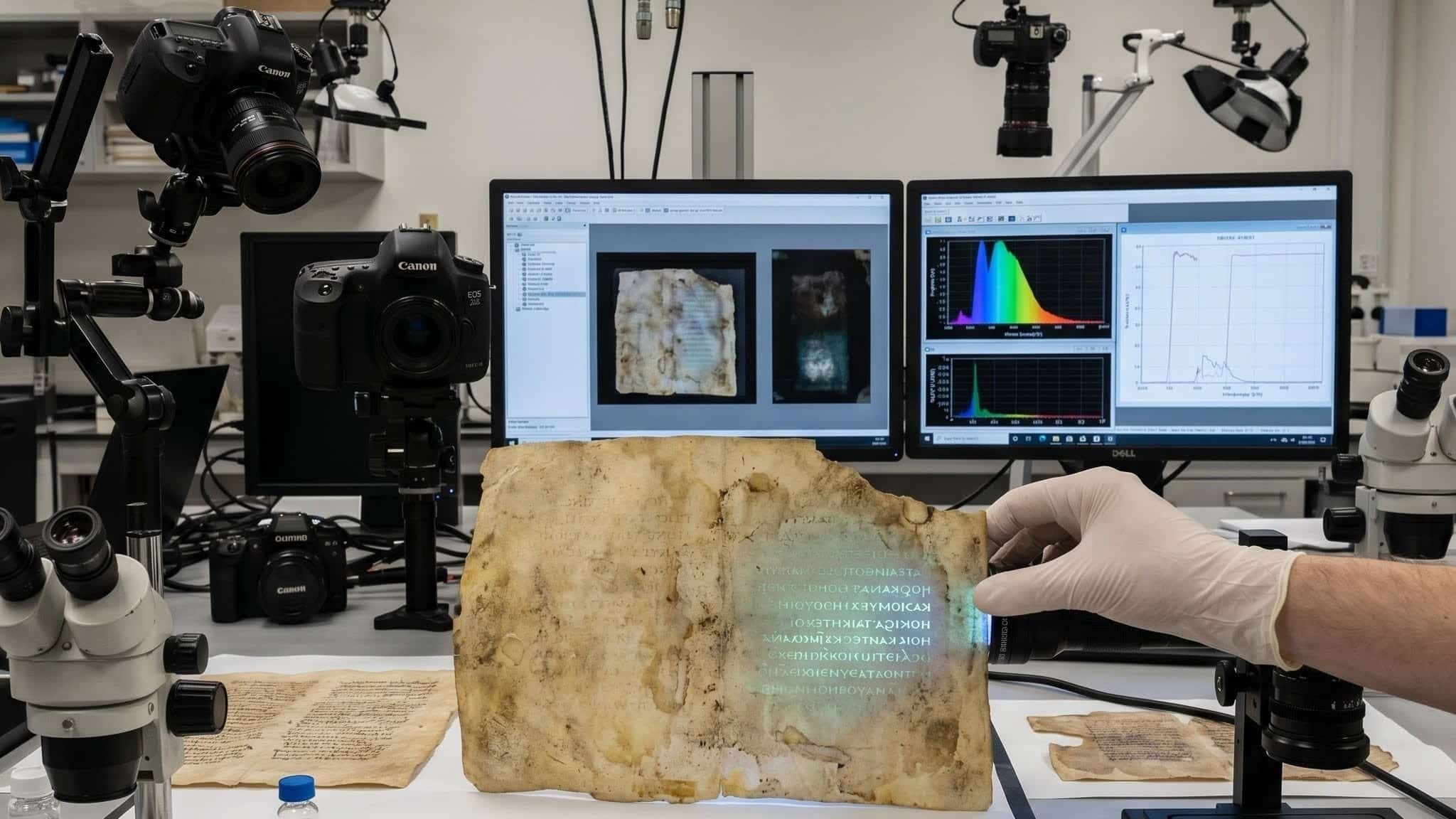 Wyobraźcie sobie, że patrzycie na starożytną kartę pergaminu – fragment bezcennego rękopisu Nowego Testamentu. Gołym okiem nie widać na niej nic oprócz przebarwień i plam. A jednak przy odpowiednim oświetleniu z tej pustki wyłania się tekst sprzed półtora tysiąca lat – lustrzane odbicie strony, która fizycznie przestała istnieć wiele wieków temu.