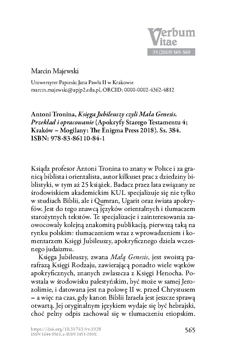 Tekst jest recenzją naukową wydania „Księga Jubileuszy czyli Mała Genesis. Przekład i opracowanie” autorstwa ks. prof. Antoniego Troniny, opublikowanego w serii „Apokryfy Starego Testamentu”. Autor przedstawia sylwetkę Troniny jako wybitnego biblisty, orientalisty i znawcy apokryfów, a następnie omawia strukturę książki: obszerne Wprowadzenie (trzy rozdziały), sam przekład Księgi Jubileuszy z komentarzem oraz synopsę fragmentów hebrajskich, greckich, łacińskich i syryjskich. Recenzja streszcza główne tezy Wprowadzenia, sposób pracy nad tekstem i ocenę wartości tego wydania dla badań nad judaizmem okresu Drugiej Świątyni.