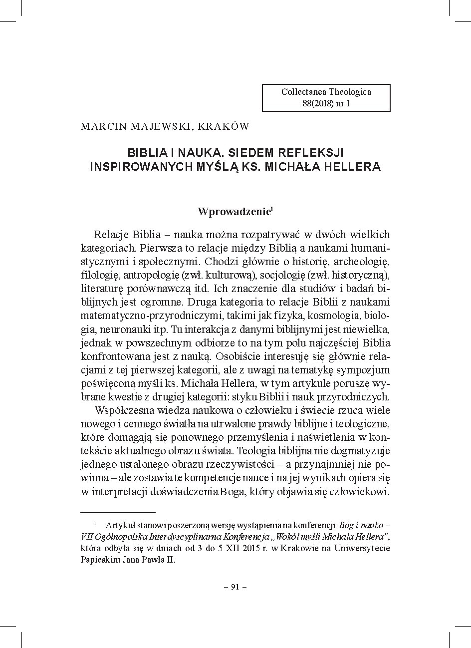 Punktem wyjścia są dwie sfery relacji Biblia–nauka: z humanistyką (historia, archeologia, filologia) oraz z naukami przyrodniczymi (fizyka, biologia, neuronauki). Artykuł koncentruje się na tej drugiej, inspirowanej myślą ks. Michała Hellera, i pyta, jak połączyć biblijne ujęcie świata z teorią ewolucji, nową antropologią i obrazem mózgu. Majewski odwołuje się do św. Augustyna i Ernana McMullina: w razie konfliktu z dobrze ustaloną teorią naukową trzeba przemyśleć interpretację tekstu biblijnego, a nie bronić literackiej formy za wszelką cenę.