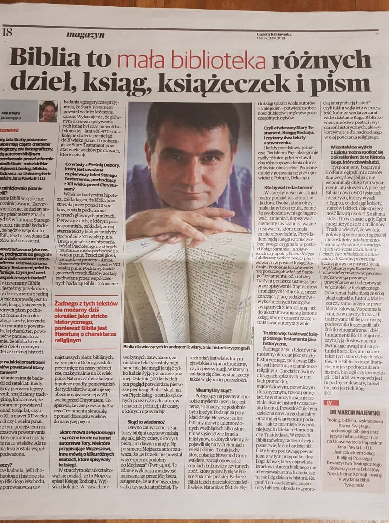 Tekst jest wywiadem opublikowanym w „Gazecie Krakowskiej”, w którym dziennikarka Julia Kalęba pyta biblistę m.in. o to, jak powstawała Biblia, czym jest Stary Testament według dzisiejszych badań, co znaczy, że jest „małą biblioteką”, oraz jak rozumieć daty, liczby i autorstwo ksiąg biblijnych. Rozmowa porusza kilka kluczowych zagadnień: czas i sposób powstawania Starego Testamentu, tradycyjne i współczesne teorie o Pięcioksięgu, rolę Mojżesza, a także sens licznych anachronizmów i symboliki liczb w Biblii. Całość zbudowana jest tak, by osoba niezajmująca się zawodowo biblistyką mogła zrozumieć, na czym polega różnica między „podręcznikiem historii” a „księgą wiary”.
