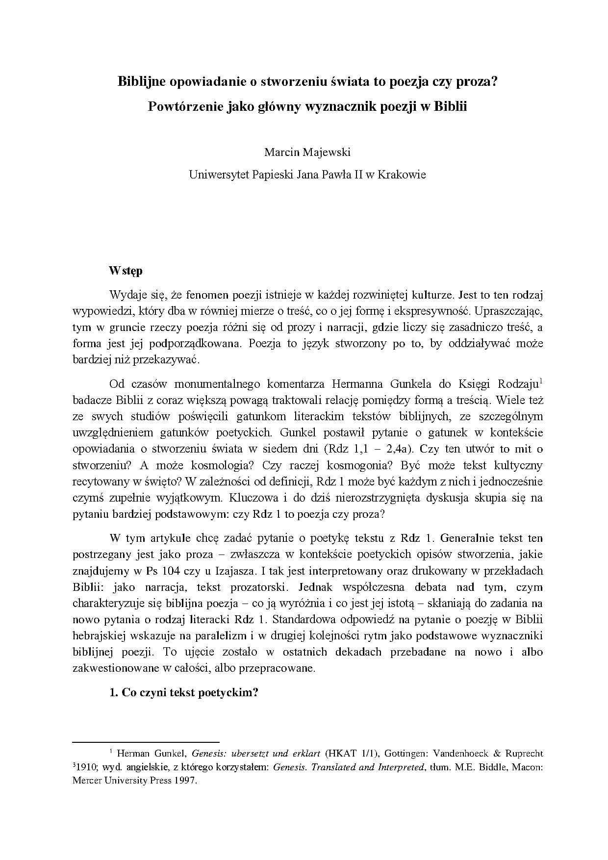 Majewski streszcza spór od Gunkela po współczesnych badaczy: czy Rdz 1 to mit, kosmogonia, tekst liturgiczny, hymn, czy raczej specyficzna ekspozycja teologii stworzenia. Omawia definicje poezji biblijnej, pokazując, że tradycyjne kryteria – paralelizm i rytm (Lowth, Berlin, Kugel, Hrushovski) – są dziś niewystarczające lub problematyczne. Zamiast prostego podziału na „prozę” i „wiersz”, autor proponuje spojrzenie na kontinuum form: proza przypominająca poezję i poezja zbliżona do prozy.