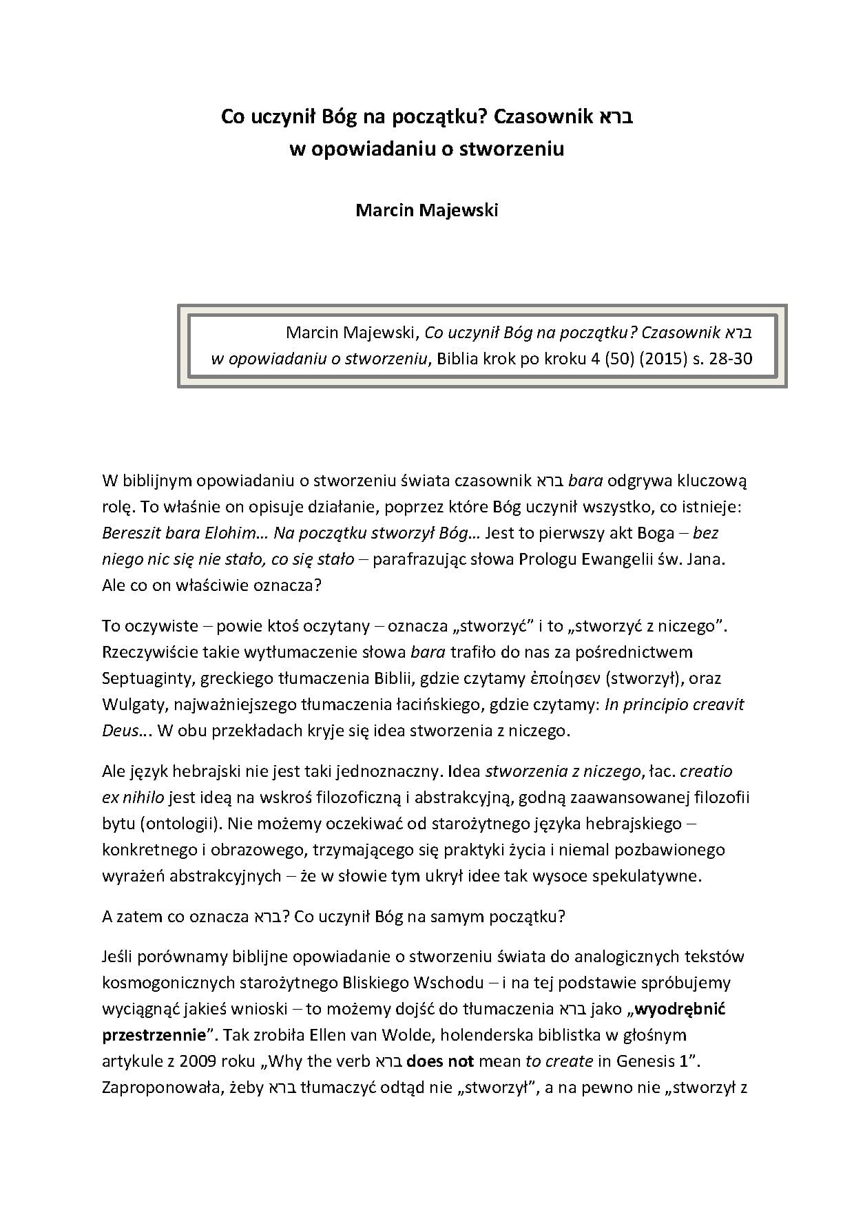 Tekst skupia się na roli bara w kosmogonii biblijnej: „Bereszit bara Elohim” – pierwszy akt Boga, bez którego „nic się nie stało, co się stało” (por. J 1,3). Autor kwestionuje dogmat „stworzenia z niczego” (creatio ex nihilo) z Septuaginty (ἐποίησεν) i Wulgaty (creavit), podkreślając, że hebrajski jest konkretny, nie abstrakcyjny. Przedstawia alternatywy: Ellen van Wolde („rozdzielił przestrzennie”, 2009), Ibn Ezra („odcinanie granic”), porównania z Enuma Elisz.
