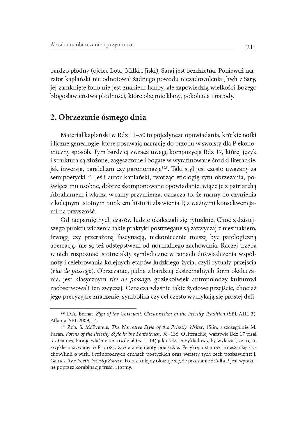 Autor zwraca także uwagę na literacką stronę tekstu: styl Rdz 17, kombinację prozy i elementów poetyckich, strukturę Bożych „mów” i niewerbalnych reakcji Abrahama, powtarzające się słownictwo w części „wypełnienia” (w. 23–27). Pokazuje, że w źródle kapłańskim forma nie jest przypadkowa: sama struktura narracji wzmacnia przesłanie o absolutnej powadze i nieodwołalności Bożego dekretu.