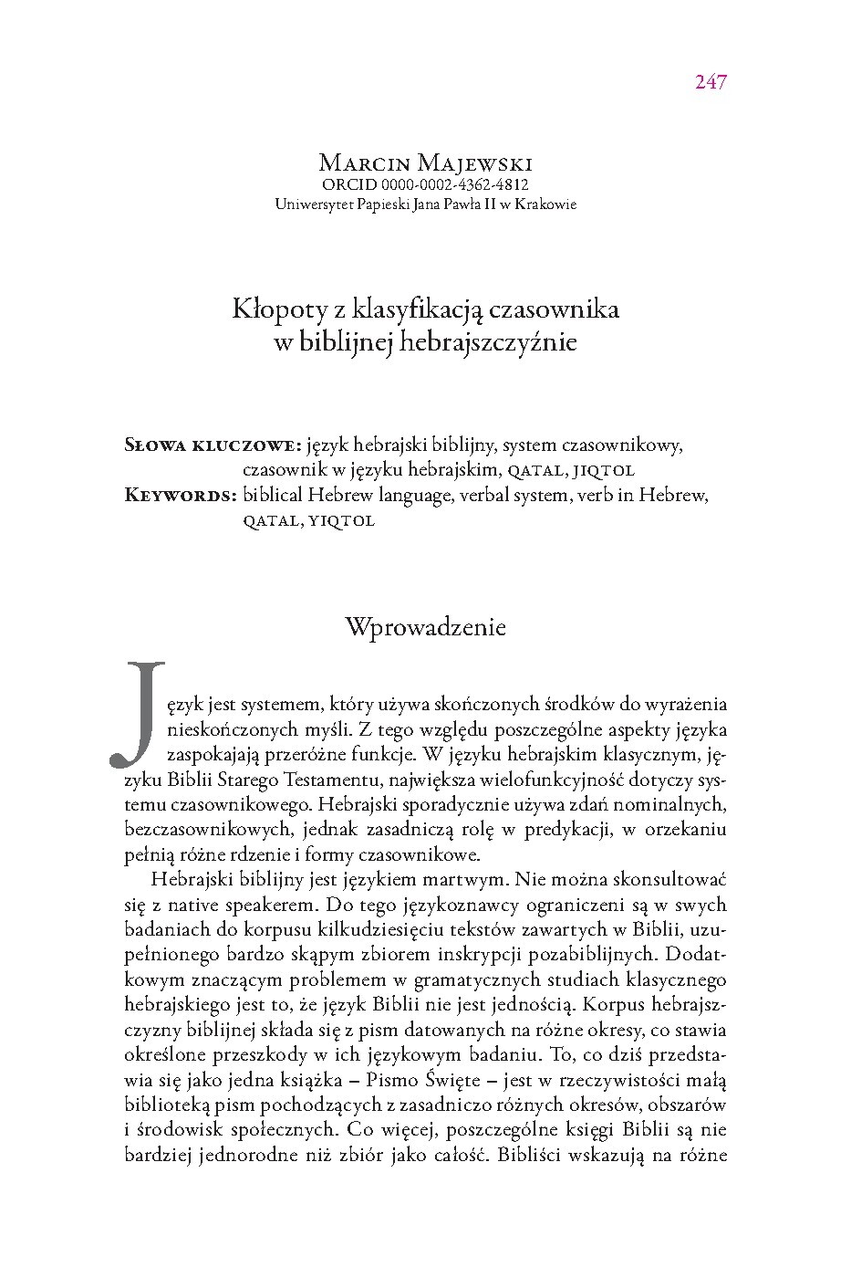 Majewski pisze jasno, pokazując, że „kłopoty z klasyfikacją” nie są porażką językoznawców, lecz naturalnym efektem spotkania dwóch systemów myślenia o czasie: semickiego i indoeuropejskiego. Dla studentów hebraistyki, biblistów, tłumaczy i wszystkich, którzy zmagają się z qatal/yiqtol na marginesie swoich Biblii, ten artykuł będzie znakomitą pomocą w przejściu od prostych, szkolnych schematów do bardziej realistycznego, dynamicznego rozumienia czasownika hebrajskiego.