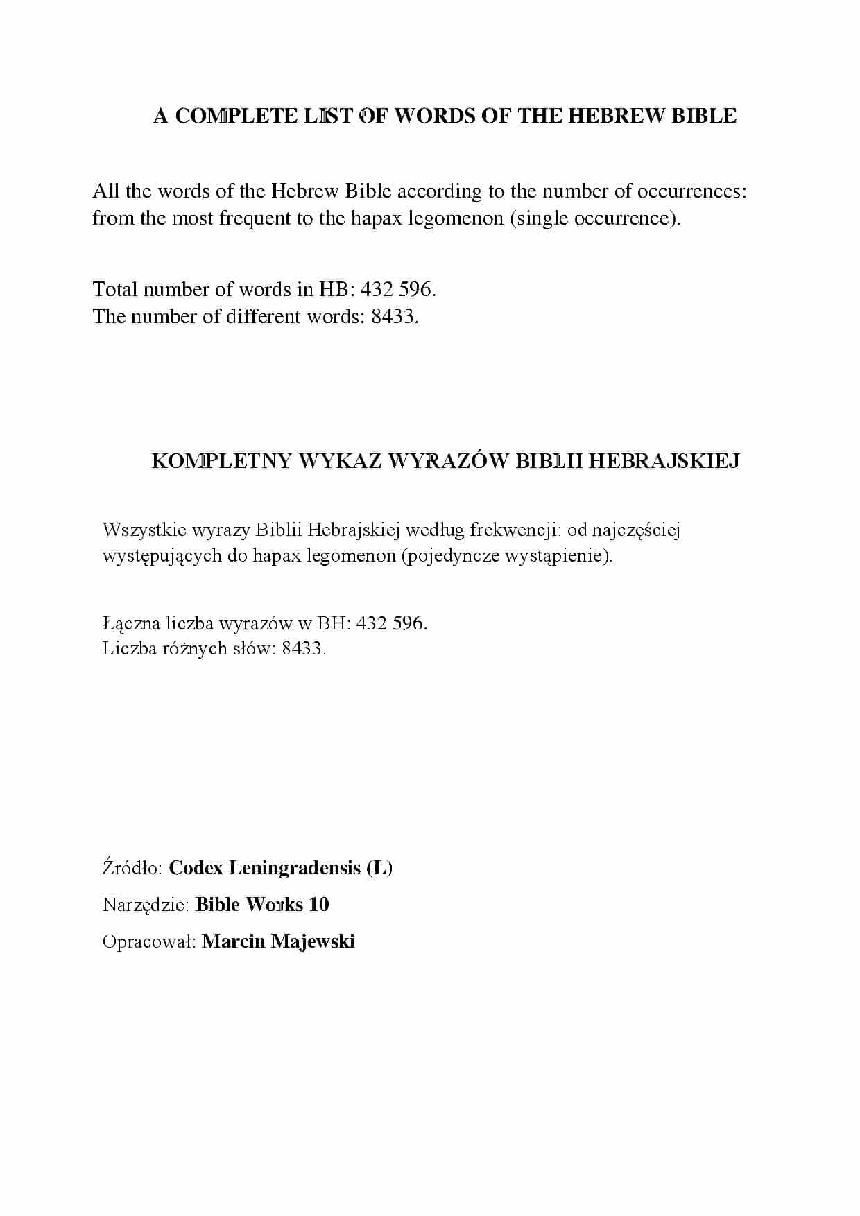 To nie artykuł ani komentarz, ale szczegółowa lista wszystkich słów Biblii hebrajskiej, ułożonych według częstotliwości występowania: od najczęstszych form, aż po hapax legomena – wyrazy pojawiające się tylko raz w całym tekście. Autor opiera się na Codex Leningradensis, standardowym tekście masoreckim, a do wyliczeń używa programu BibleWorks 10, co daje solidną, „techniczną” podstawę zestawienia. Na początku podaje dwie kluczowe liczby: łączną liczbę słów w Biblii hebrajskiej (432 596) oraz liczbę różnych form leksykalnych (8433), co od razu pokazuje skalę materiału.