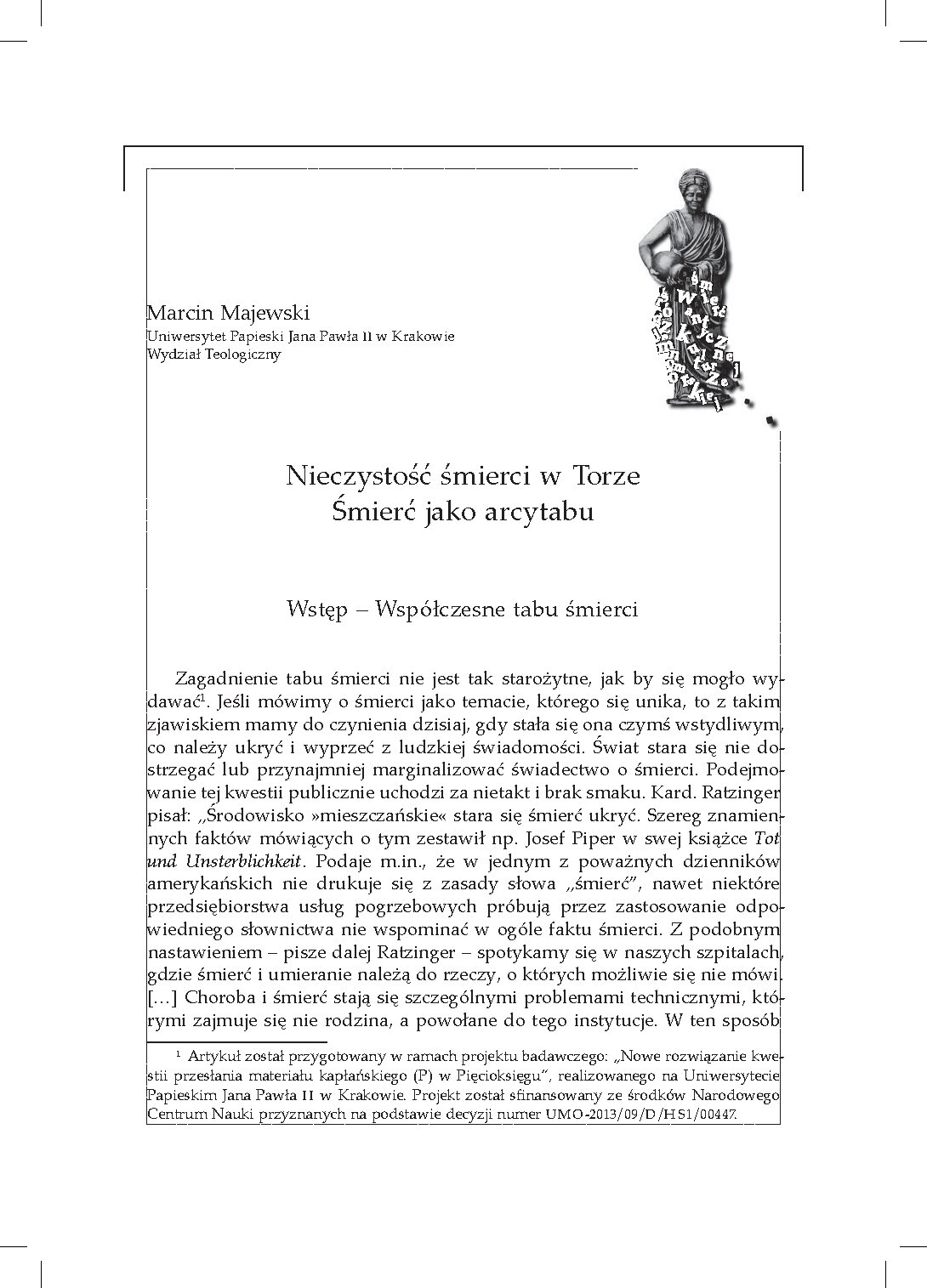 Majewski zestawia te intuicje z naszym dzisiejszym „miękkim tabu”, które śmierć raczej maskuje niż nazywa po imieniu. Pokazuje, że choć formy tabu się zmieniają, źródłowy lęk i poczucie obcości śmierci pozostają; różnica polega na tym, czy tabu prowadzi do milczenia i wypierania, czy – jak w Biblii – do rytuału, nazwania i oswojenia poprzez włączenie w narrację wiary.