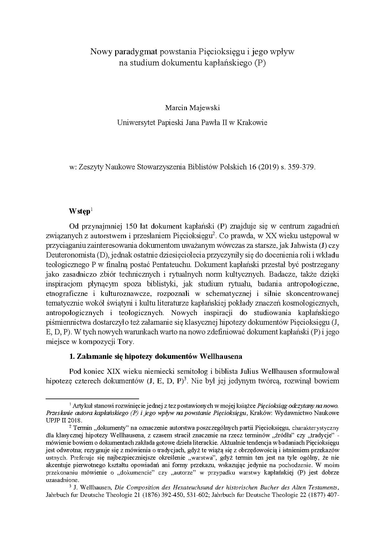 Tekst to naukowy artykuł biblijny, który opisuje zmianę paradygmatu w badaniach nad powstaniem Pięcioksięgu oraz konsekwencje tej zmiany dla rozumienia dokumentu kapłańskiego (P). W pierwszej części autor syntetycznie przedstawia historię i załamanie klasycznej hipotezy dokumentów (J, E, D, P) Juliana Wellhausena, która przez ponad sto lat dominowała w egzegezie. W dalszych częściach pokazuje, jakie nowe modele powstawania Pięcioksięgu zaproponowano po kryzysie tej hipotezy, ze szczególnym uwzględnieniem tezy, że tradycje Księgi Rodzaju (patriarchowie) i Księgi Wyjścia (exodus) rozwijały się początkowo niezależnie i zostały połączone dopiero przez autora/redaktora kapłańskiego.