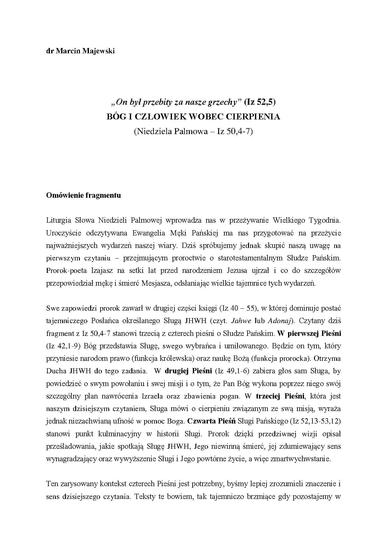 Warto sięgnąć po ten tekst szczególnie w czasie Wielkiego Tygodnia, ponieważ pomaga on spojrzeć na mękę Chrystusa oczami proroka Izajasza i zrozumieć, że Jezusowe cierpienie nie jest przypadkiem ani absurdem, ale wypełnieniem długo przygotowywanego planu miłości i zbawienia. Komentarz łączy solidną egzegezę (kontekst czterech Pieśni, analiza obrazów i gatunku „rozprawy sądowej”) z pytaniami dotykającymi bardzo konkretnie życia: co robię z własnym cierpieniem, jak przeżywam niesprawiedliwe oskarżenia, czy umiem – jak Sługa – oprzeć się na Bogu, zamiast odpłacać złem za zło. Tekst dobrze nadaje się zarówno do osobistej modlitwy Słowem Bożym, jak i do pracy w grupie (dzięki części „Pogłębienie”) czy przygotowania homilii na Niedzielę Palmową, bo pomaga połączyć biblijną głębię proroctwa z bardzo aktualnym pytaniem: jak Bóg i człowiek stają wobec tajemnicy cierpienia – i co zmienia w tym wszystkim obecność cierpiącego Sługi, którym dla chrześcijan jest Jezus.