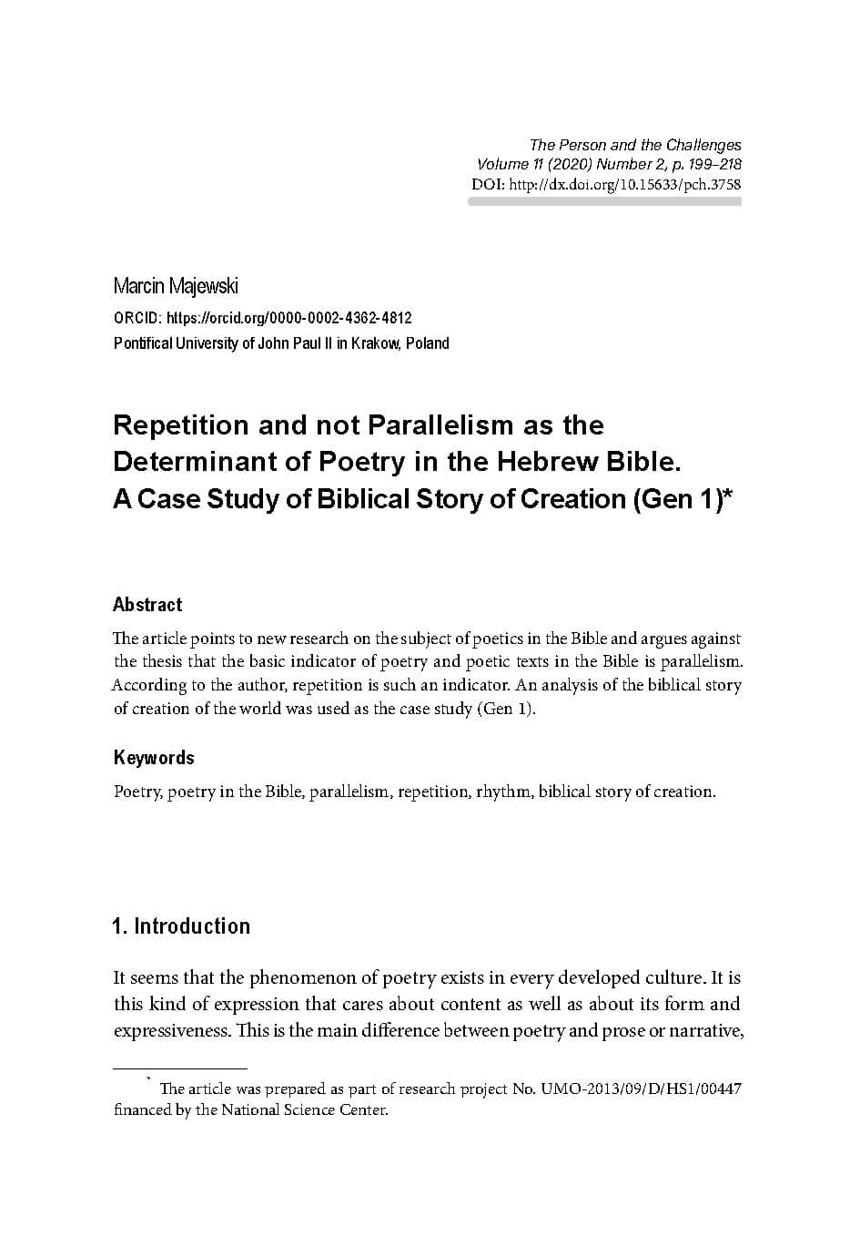 Autor zaczyna od ogólnego pytania: jak rozpoznać poezję w Biblii i czy Rdz 1 to proza, czy jednak tekst o wyraźnych cechach poetyckich. Przypomina, że tradycyjnie, od czasów Lowtha, za główny wyznacznik poezji hebrajskiej uważano paralelizm (synonimiczny, antytetyczny, „syntetyczny”), a większość wierszy i psalmów interpretowano jako zestaw tak ułożonych wersów. Jednocześnie współczesne badania (Kugel, Berlin, Geller i inni) pokazały, że cechy przypisywane „poezji” występują także w prozie, a sam paralelizm ma dziesiątki odmian i nie wyczerpuje bogactwa form biblijnego języka artystycznego.