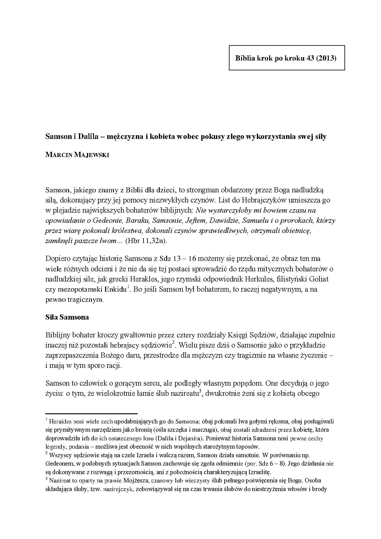 Artykuł skupia się na paradoksie Samsona: mężczyzny o nadludzkiej sile fizycznej, ale bez kontroli nad popędami, który łamie ślub nazireatu, żeni się z cudzoziemkami, mści się osobistą zemstą i ulega Dalili. Autor analizuje, jak Samson wykorzystuje Boży dar egoistycznie, tracąc go ostatecznie, i kontrastuje to z rolą Dalili – kobiety, która swoją siłę (urodą i podstępem) kieruje ku destrukcji dla pieniędzy. Historia ukazana jest jako przestrogę przed złym używaniem darów, z naciskiem na symbolikę włosów jako znaku relacji z Bogiem.