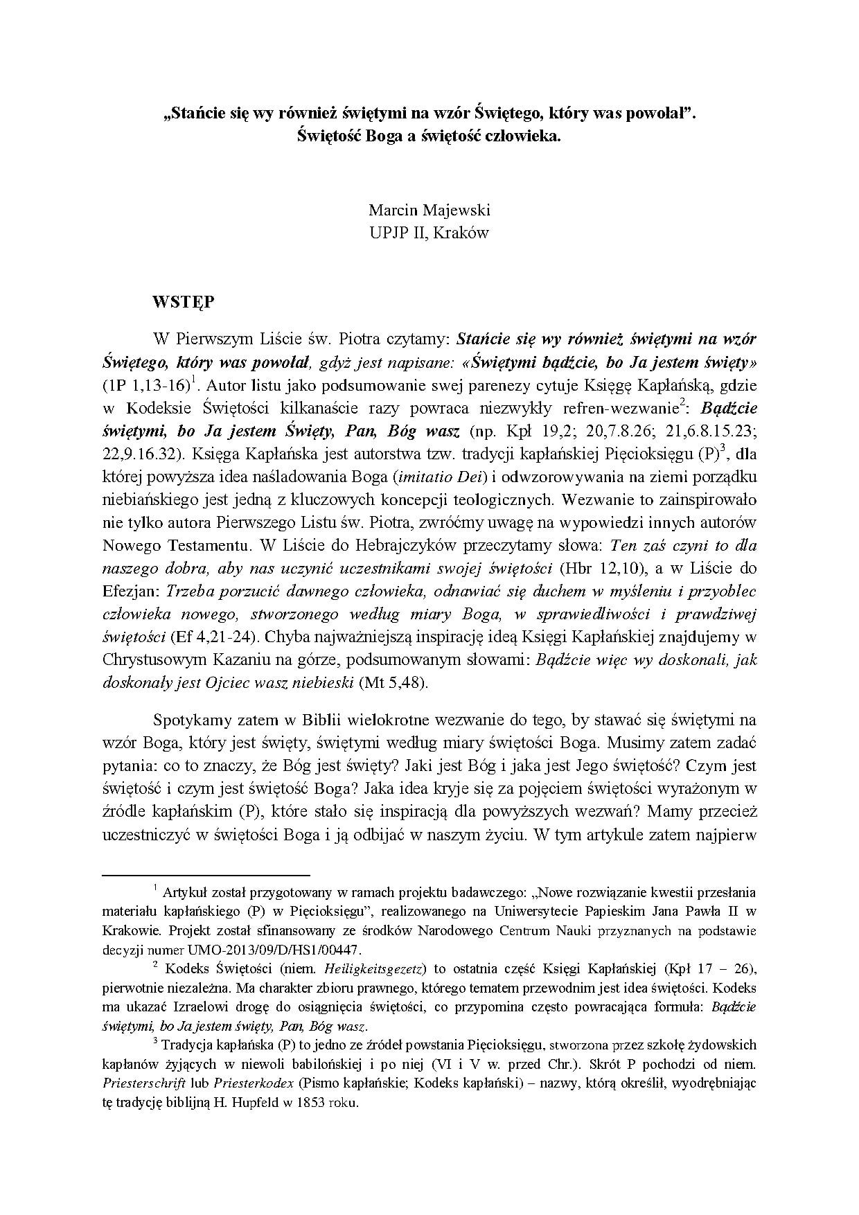 Tekst analizuje biblijne pojęcie świętości najpierw w odniesieniu do Boga, a następnie do człowieka, pokazując, jak te dwie rzeczywistości są ze sobą powiązane. Autor wychodzi od starotestamentowego języka świętości (termin qādôš i jego derywaty), ukazując świętość jako radykalną „inność” i odrębność Boga od świata, a zarazem Jego dynamiczną obecność pośród Izraela – zwłaszcza w kulcie, świątyni, przymierzu i prawie. Następnie przechodzi do analizy kluczowych tekstów, w których świętość Boga staje się wzorem i wezwaniem do świętości człowieka (szczególnie z Księgi Kapłańskiej i tekstów prorockich), przygotowując przejście do perspektywy nowotestamentowej.