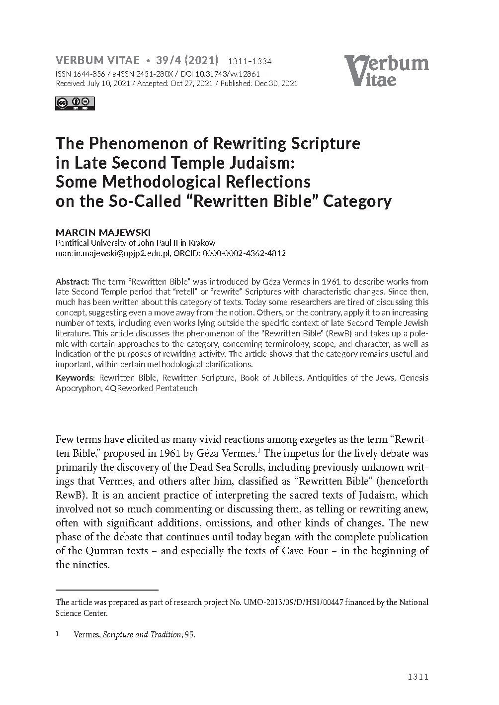 Autor wychodzi od pojęcia „Rewritten Bible” (RewB), zaproponowanego przez Gézę Vermesa w 1961 r. na określenie dzieł z późnego okresu Drugiej Świątyni, które „opowiadają na nowo” biblijne historie, wprowadzając charakterystyczne uzupełnienia, skróty i zmiany. Pokazuje, że odkrycia z Qumran (zwłaszcza pełna publikacja zwojów z Groty 4) ujawniły skalę tego zjawiska i wywołały intensywną dyskusję: jedni badacze są już zmęczeni samym terminem i chcą go porzucić, inni przeciwnie – rozszerzają go na coraz więcej tekstów, nieraz daleko poza judaizm epoki Drugiej Świątyni. Artykuł odpowiada na to napięcie: analizuje fenomen „przepisywania Pisma”, polemizuje z niektórymi ujęciami, precyzuje terminologię („Rewritten Bible” czy raczej „Rewritten Scripture”), zakres zjawiska i jego charakter, a na końcu broni użyteczności kategorii pod pewnymi metodologicznymi warunkami.