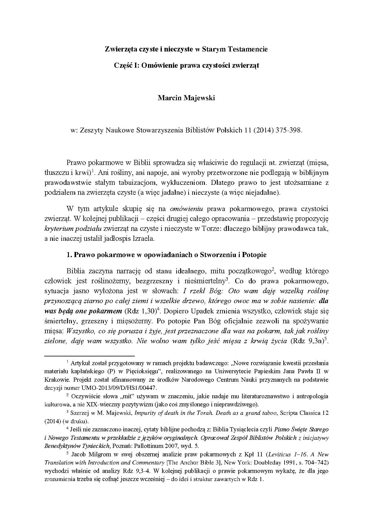 Autor pokazuje, że biblijne prawo pokarmowe dotyczy niemal wyłącznie zwierząt – ich mięsa, tłuszczu i krwi – podczas gdy rośliny, napoje i produkty przetworzone nie podlegają stałym tabu. Dlatego w świadomości biblijnej prawo pokarmowe praktycznie utożsamia się z rozróżnieniem na zwierzęta czyste i nieczyste. Niniejszy artykuł (część I) omawia samą strukturę i treść tego prawa, a zapowiadaną część II autor poświęci wyjaśnieniu kryteriów podziału – dlaczego konkretnie te, a nie inne gatunki uznano za czyste lub nieczyste.